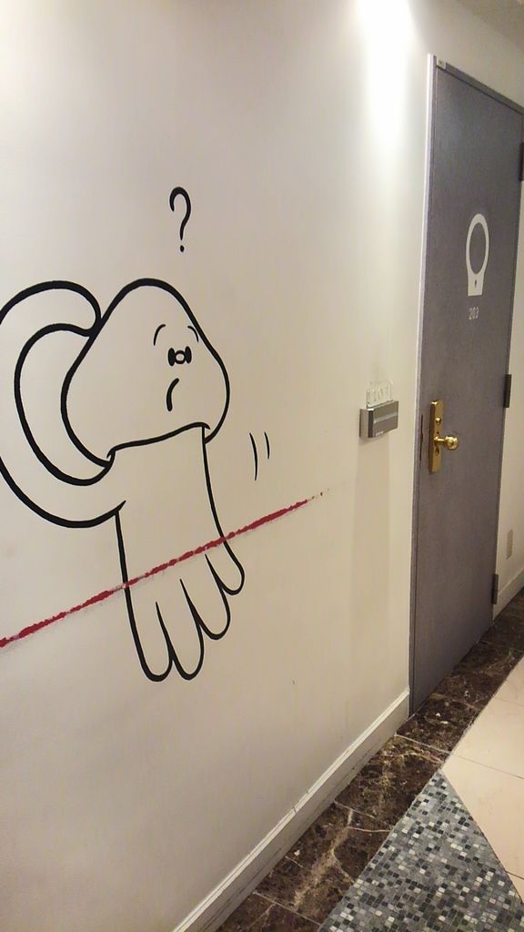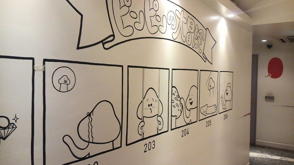 壁に謎のキャラクターの絵。